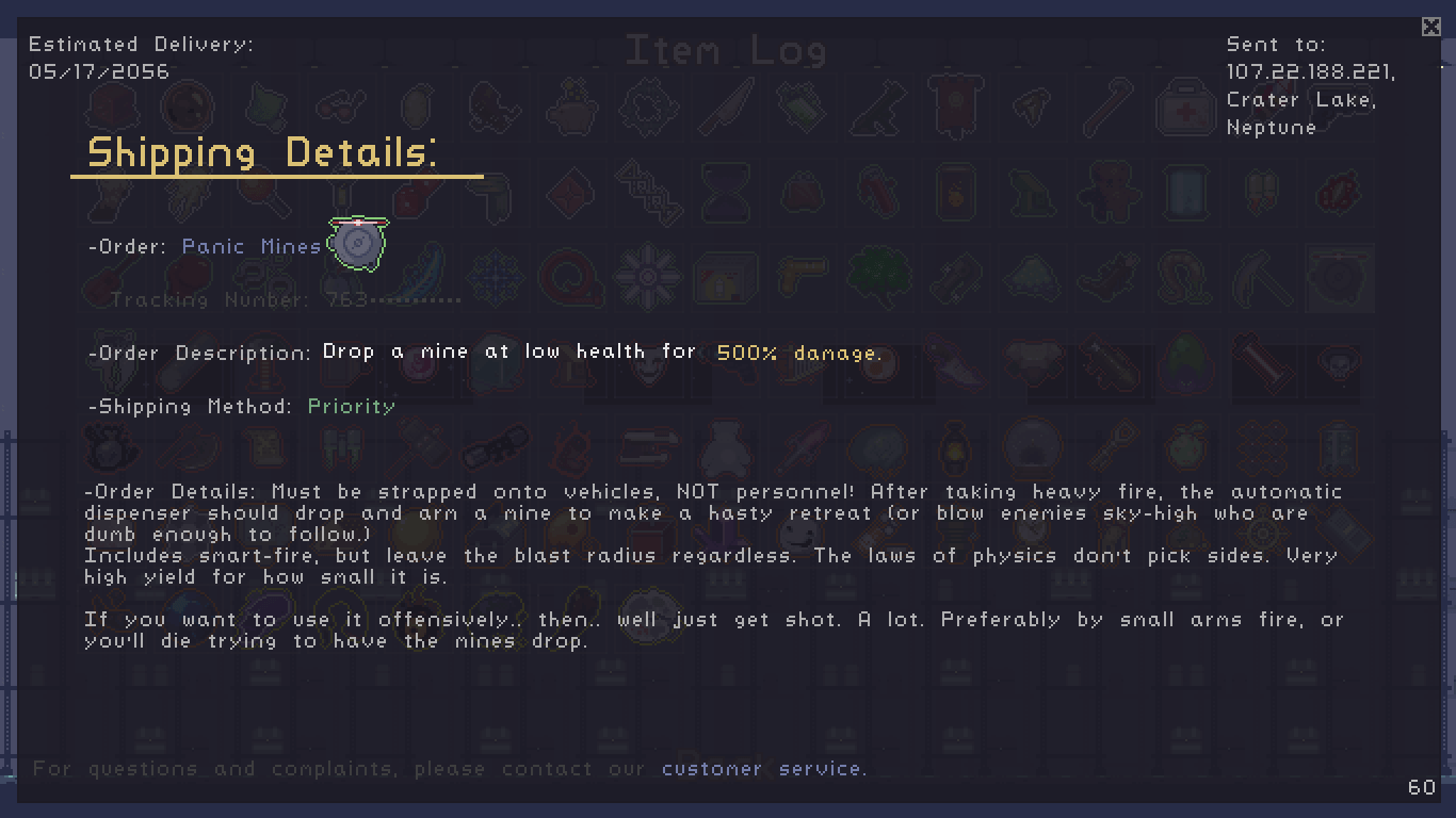 Detalles de la ordenIncluye disparo inteligente, pero deja un radio de explosión a pesar de todo. Las leyes de la física no escogen extremos. Rendimiento muy alto para lo pequeño que es. Si quieres usarlo de manera ofensiva... entonces... bueno, solo recibe un disparo. Muchos. Preferiblemente por fuego de armas pequeñas, o morirás tratando de que caigan las minas. | |||