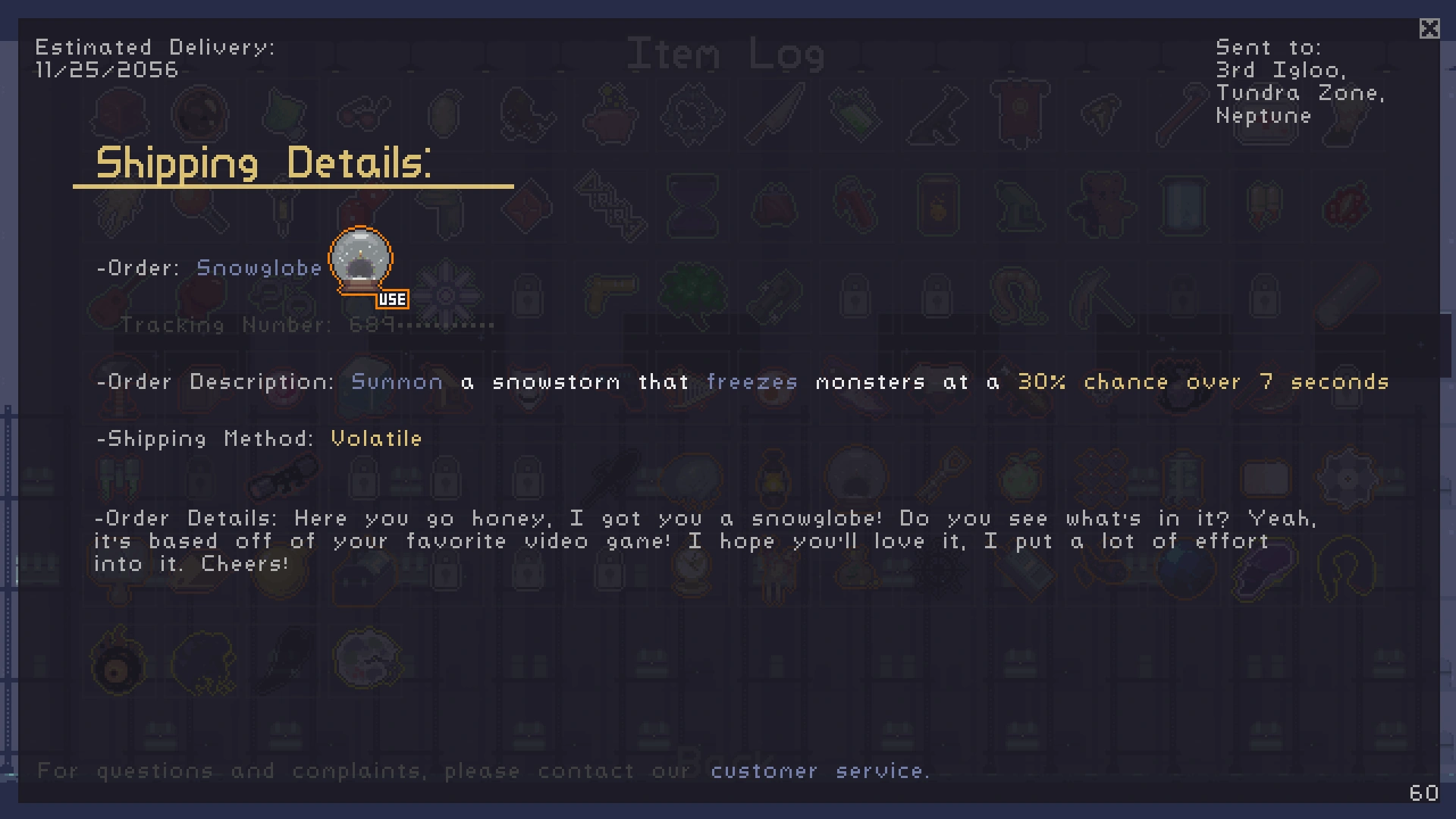 The Snowglobe is a use item in Risk of Rain that creates a heavy snowstorm that randomly freezes all monsters on the screen at a 30% chance and lasts for 7–8 seconds.